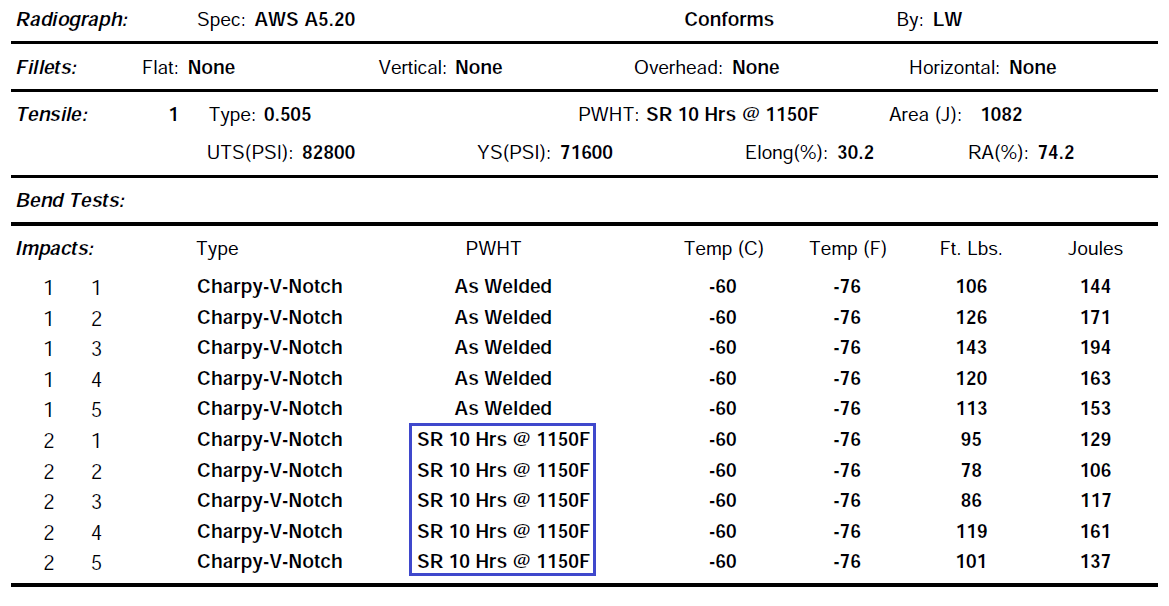 3、可满足焊后热处理620 10-13小时, 依然满足-60℃的冲击要求和屈服抗拉的强度要求;